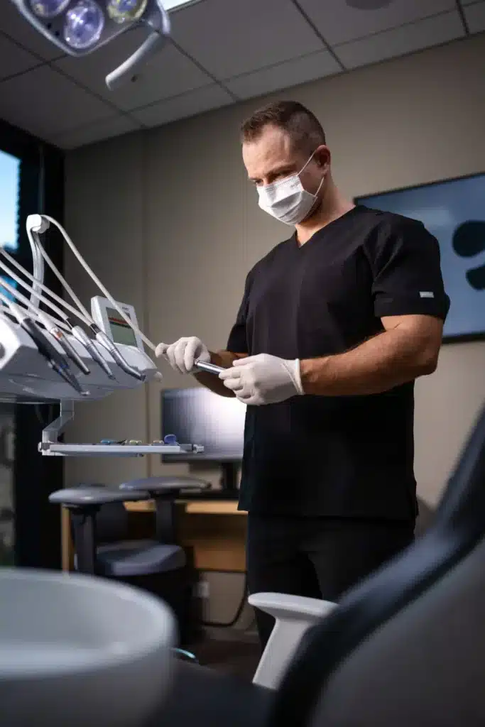 Teeth are ground down for a crown or bridge, or the jaw is prepared for the attachment of a prosthesis or implant.
